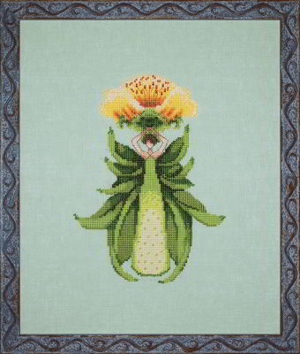 Counted cross stitch chart by Nora Corbett. NC316 Orange Princess (Petal Pushers series) was stitched over two threads on 32-count Star Sapphire Linen (Alt fabric 14ct Mystic Grey Aida) with an approximate finished size of 5.75"w x 7.81"h. Specialty items needed: Mill Hill Beads 02033(1), 02104(1), 02082(1), 10002 (1), 62041 (1), 62049 (1) and Caron Waterlilies CWL273. You may want to try YLI's Wonder Invisible Thread to attach beads. Search for WT212.
