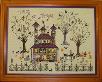 Cross stitch chart by Praiseworthy Stitches. Stitched on 30ct Bitter Betty Brew Linen by R&R Reproductions (but you can use any neutral, light or even spooky fabric you like!) using Gentle Art Sampler Threads (Bittersweet, Tin Bucket, Moonlit Path), Weeks Dye Works (Skinny Dip, Sage, Thyme, Molasses, Basil, Charcoal, Taffeta, Squash, Stone, Purple Peoria Purple, Kohl), Crescent Colours (Crushed Pineapple, Timber, Candied Yams, Pumpkin Harvest, Snowball, Frozen Margarita) and DMC Metallic Thread (5283). DMC equivalents for the entire design are 948, 370, 318, 3021, 3051, 844, 550, 973, 840, 321, 310, 731, 535, 453, 3822, 3790, 3778, 920, 704, 5283 and white. Mill Hill beads (42031 and 42043) and Just Another Button Company buttons adorn this design. Stitch count: 369w x 272h.