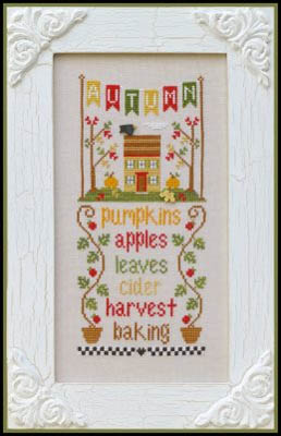 Cross stitch chart by Country Cottage Needleworks. Model was stitched on Lakeside Linens' 32 count Lentil Linen using DMC floss, Classic Colorworks (Bean Sprout), and Gentle Art (Harvest Moon). Stitch count: 142h x 67w