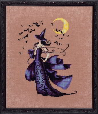 Cross stitch chart by Nora Corbett Designs from her Bewitching Pixies series. Suggested fabric: 6595 32ct Milk Chocolate Linen or Alt Fabric 35795 14ct Milk Chocolate Aida. Also uses DMC floss and Mill Hill Beads 02056 (1), 02085 (1), 10019 (1). Approximate Size: 6.9"w x 13.1"h