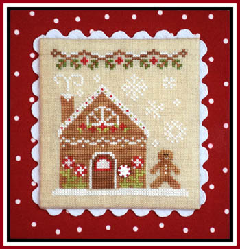 Cross stitch chart by Country Cottage Needleworks. Size: 55w x 60h. Button is optional and so darn cute! Fourth in the Gingerbread Village series. Click here to see entire design. Stitch it separately or as the whole Gingerbread Village.
